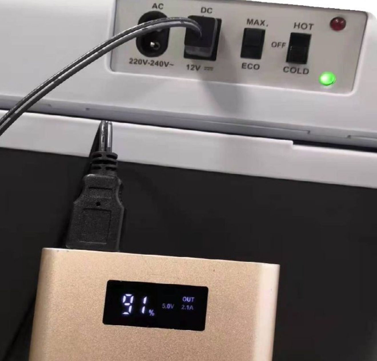 Три варіанти живлення: працює від автомобільного прикурювача (12V), електромережі (220V), а також від Power Bank (5V), що робить холодильник мобільним і незалежним від мережі.