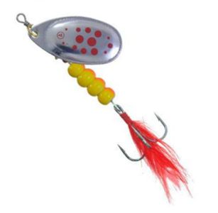 Додатковий ефект створюють яскраві кульки жовто-червоного кольору, які виступають візуальними подразниками. Оснащення включає трійник із мушкою, що не лише маскує гачок, але й підсилює привабливість приманки для хижака, стабілізуючи її в процесі проводки.