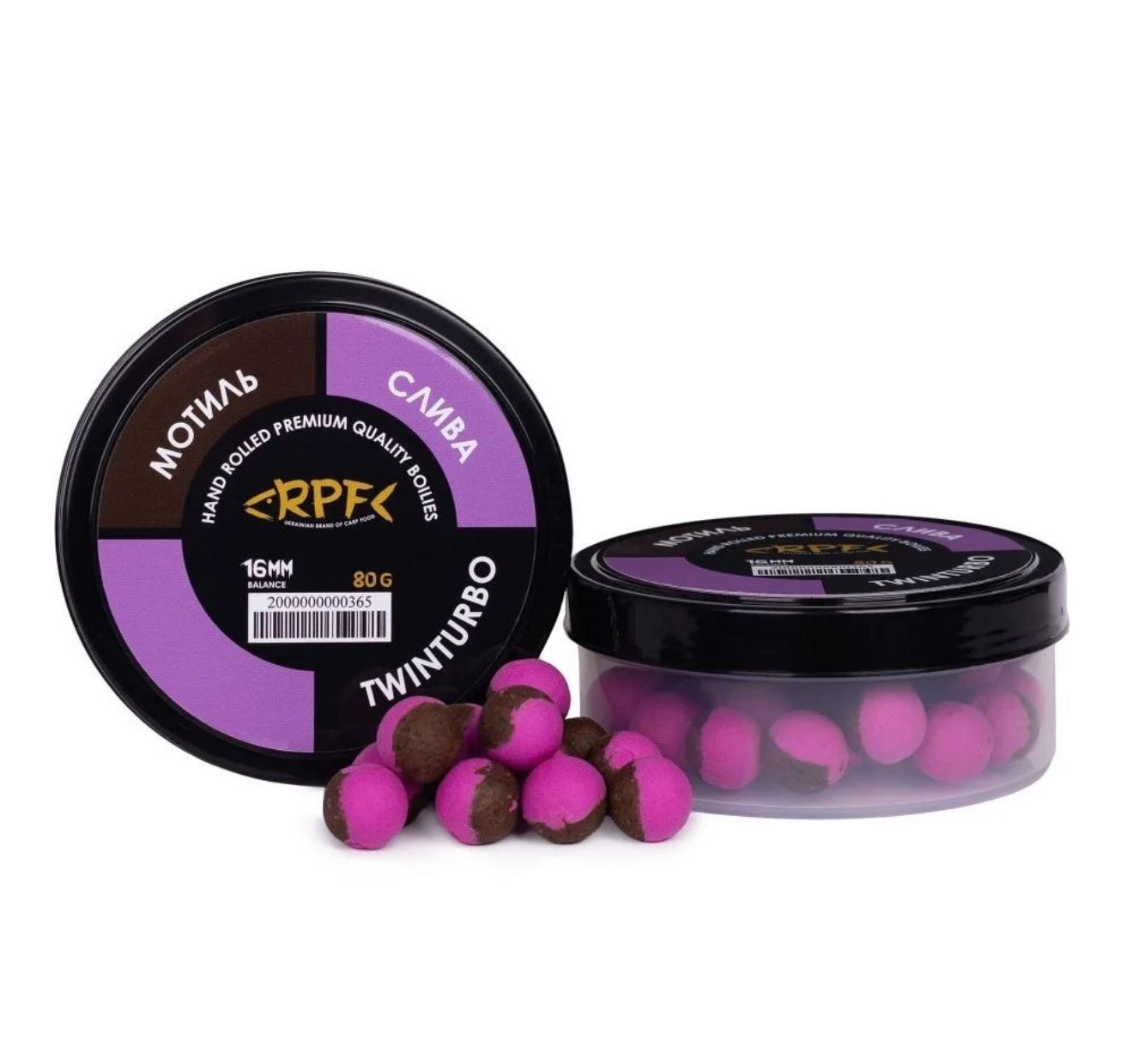 Бойли RPF – Мотиль + Слива – Ø16 мм – Баланс TwinTurbo (Тонучий + Поп-ап) – Нейтральна плавучість – Дво кольорові