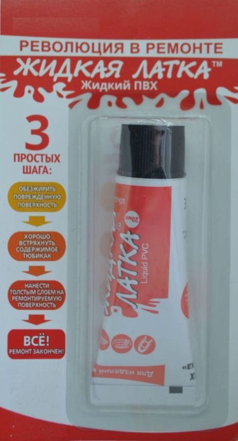 Жидкая Латка – це універсальний клей для ремонту будь-яких виробів із ПВХ, включаючи надувні човни, матраци, басейни, взуття, вироби з неопрена та триламінату. Засіб простий у використанні, зберігає еластичність матеріалу та дозволяє швидко й ефективно усунути порізи, проколи та потертості.