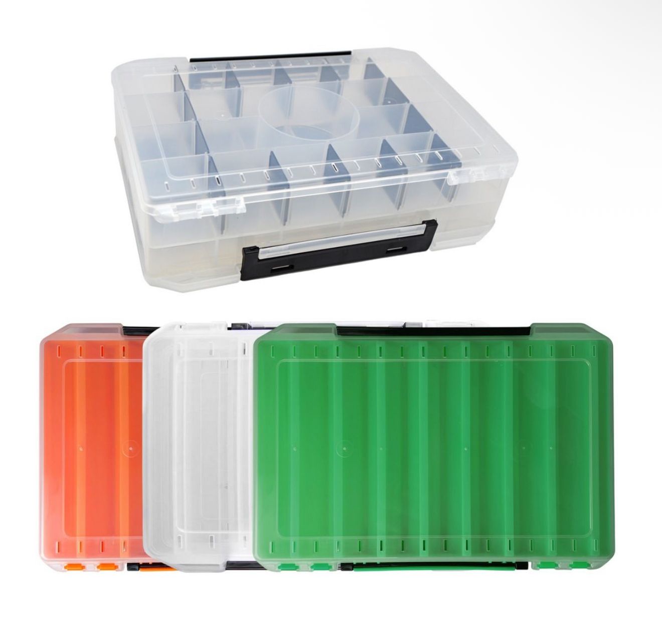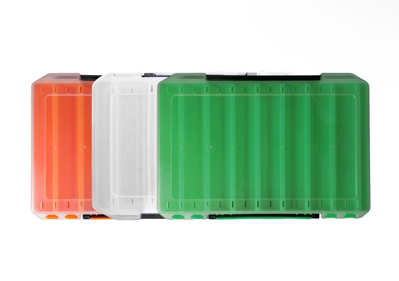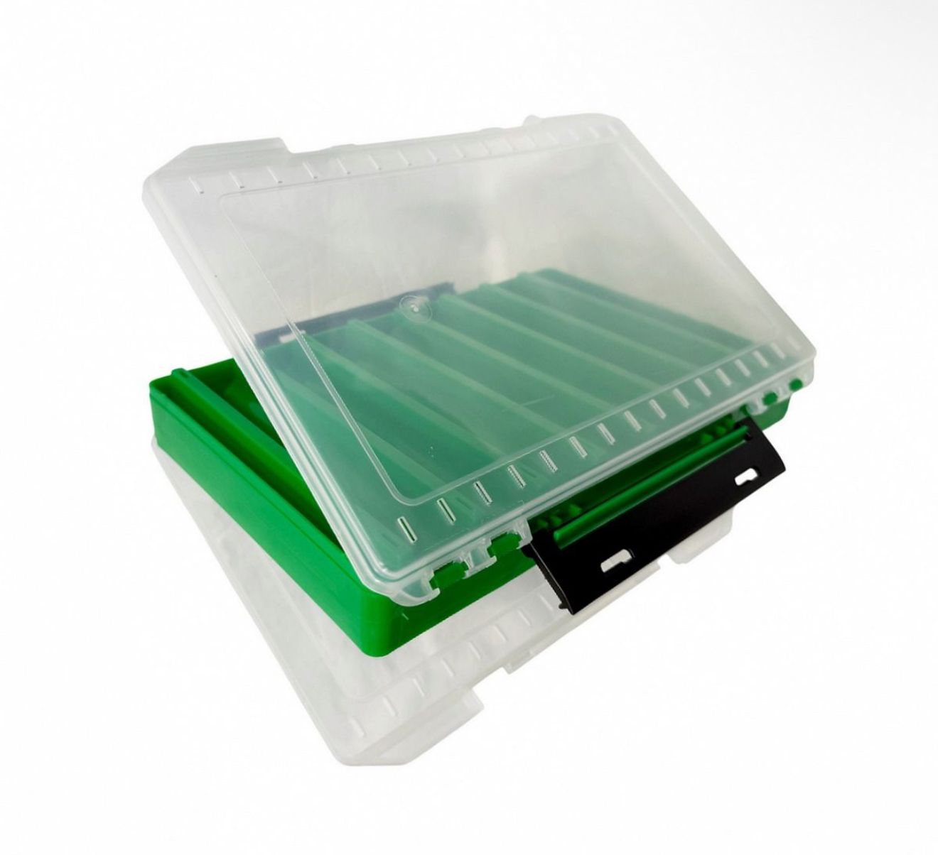 Модель оснащена надійними замками та продуманою ергономікою. Відкривається з двох боків. Корпус стійкий до ударів, а прозорі стінки дозволяють легко вибрати потрібний воблер без відкриття коробки. Регульовані перегородки запобігають пошкодженню приманок під час транспортування.