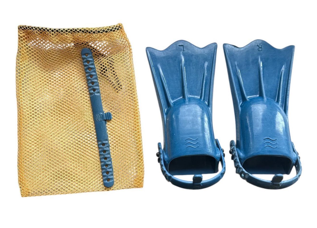 Еластична фіксуюча стрічка довжиною 20 см має 12 отворів (по 6 з кожного боку) для індивідуального регулювання. У комплекті – ліва та права ласта з відповідним маркуванням (L та R), а також сумка для зручного зберігання та транспортування.