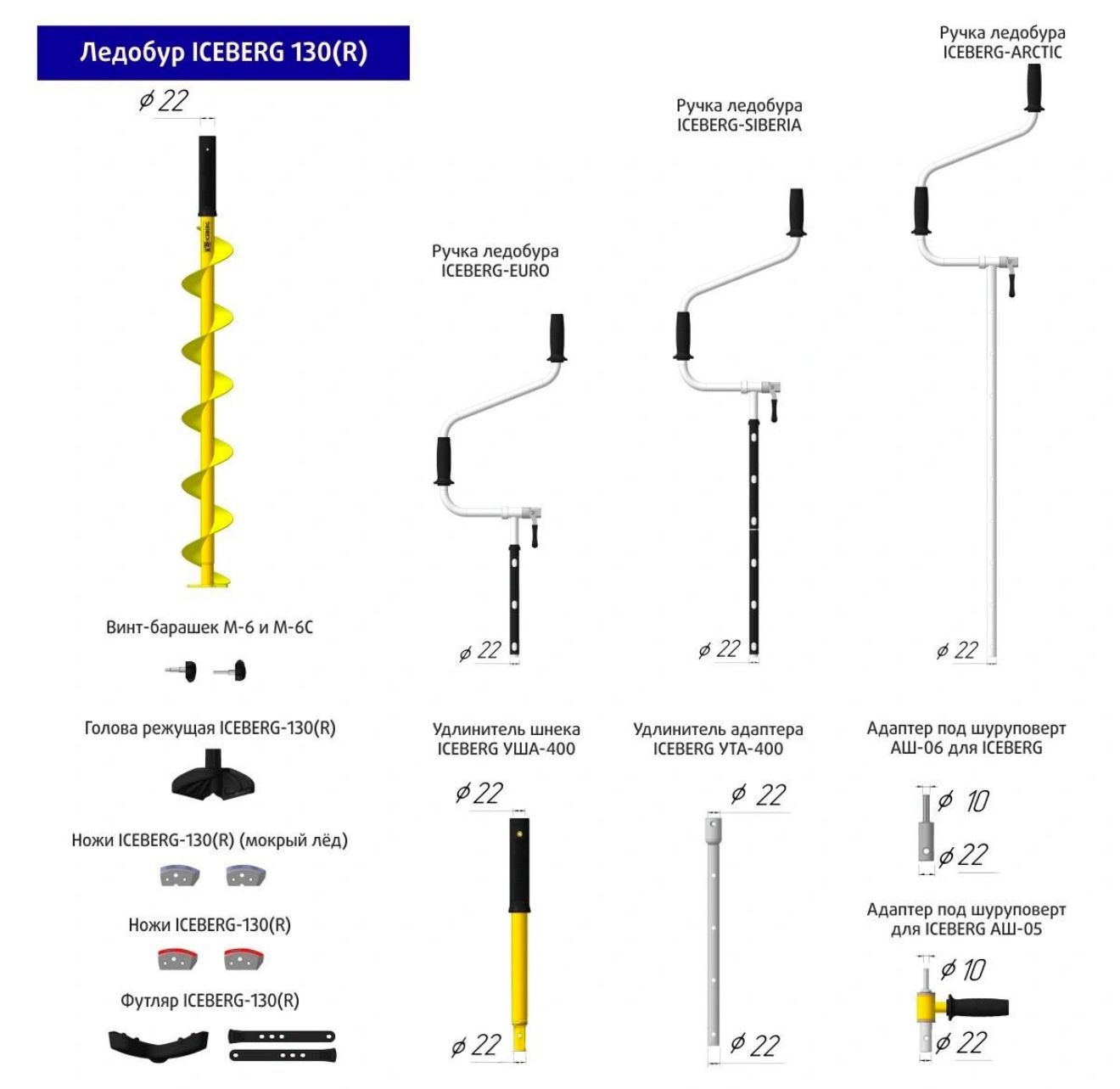 Льодобур ICEBERG-SIBERIA 130R-1600 v3.0 з правим обертанням ідеально підходить для буріння сухого та мокрого льоду. Новий запатентований механізм складання рукоятки виключає люфти та робить приведення льодобура у робочий стан швидким і зручним.