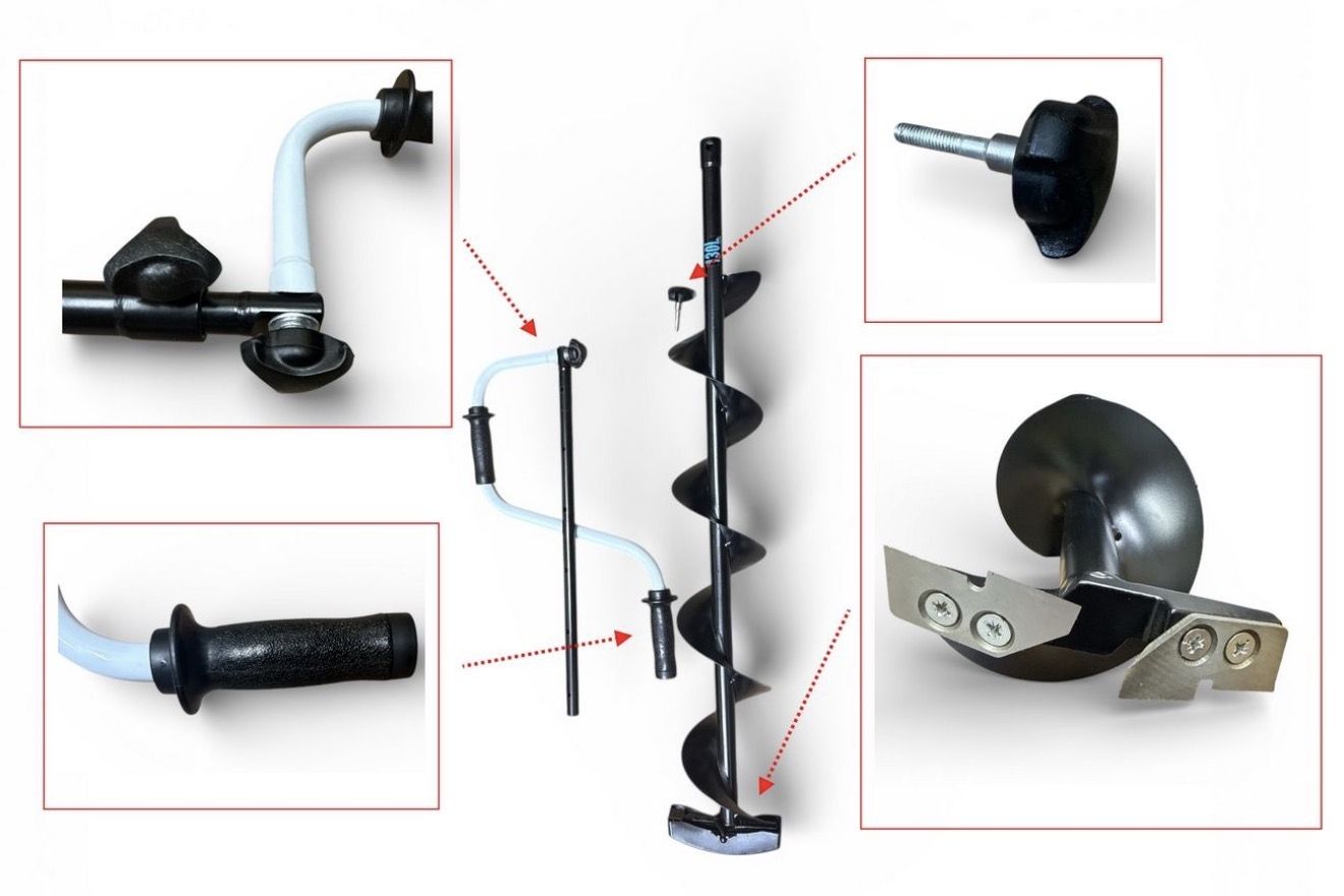 Рукоятки розміщені зі зміщенням відносно осі шнека: верхня — 105 мм, нижня — 165 мм. Така конструкція дозволяє ефективно працювати двома руками, рівномірно розподіляти навантаження та значно пришвидшує процес буріння навіть при великій товщині льоду.