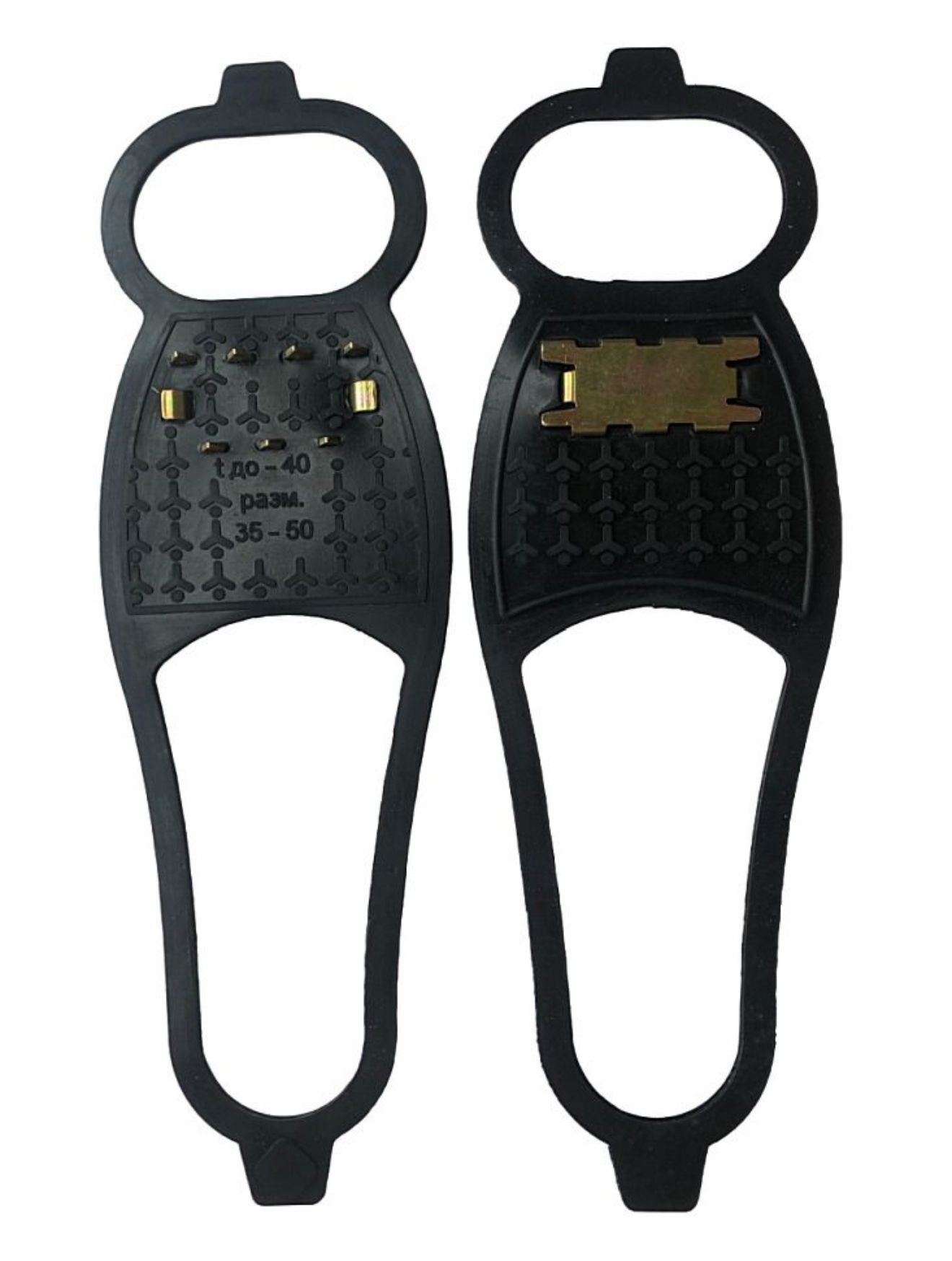 Підходять на взуття від 35 до 50 розмірів. Можуть використовуватися при температурах до –40°C. Накладки легко одягаються та знімаються, не пошкоджуючи взуття.