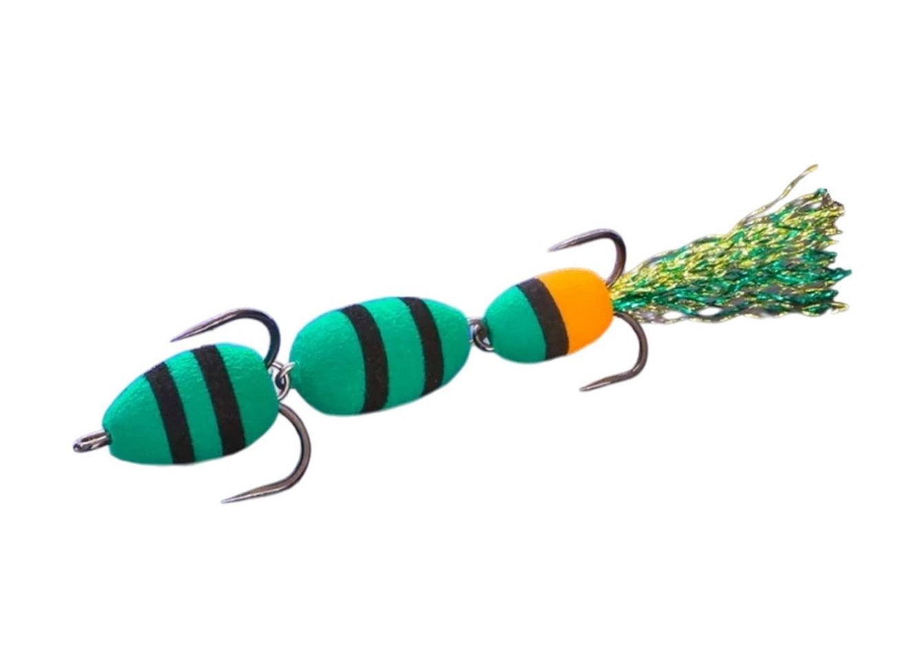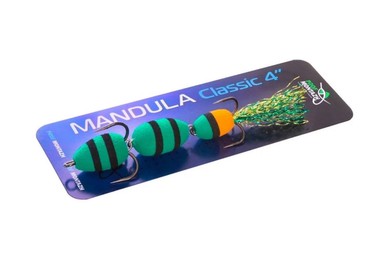 Загальна довжина 10 см робить мандулу універсальною – вона ефективно працює при ловлі судака, щуки, окуня, сома та жереха. Оснащена двома гострими трійниками №2 та №4. Хвіст прикрашений двоколірним люрексом, який під час виробництва додатково розпушується вручну для більшої привабливості у воді.