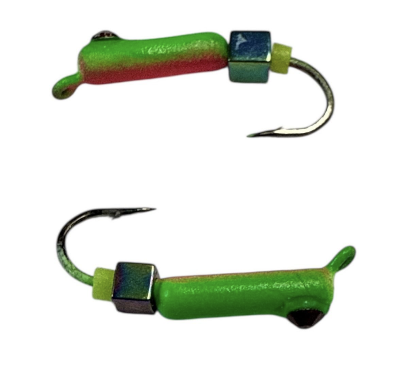 Подовжена форма «Гвоздика» з підвішеним декоративним елементом у вигляді «котячого ока» з кубиком хамелеон створює додаткові візуальні та звукові подразники. Під час гри кубик контактує з тілом мормышки, підсилюючи привабливість приманки для риби.