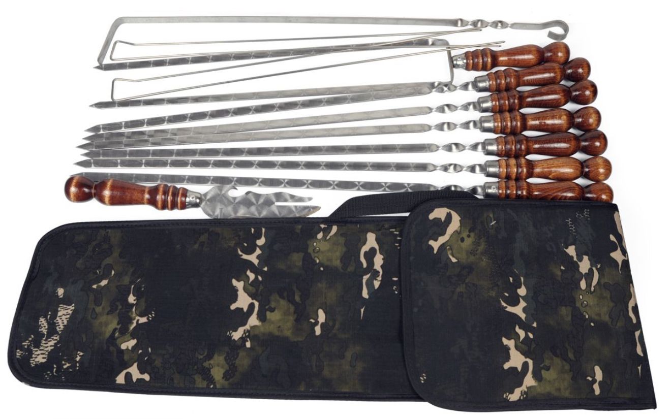 Набір шампурів – необхідний атрибут кожного пікніка. У ньому є все необхідне для смачного та комфортного відпочинку на природі: шампура, похідний мангал, кочерга, зручний чохол для зберігання та перевезення приладів із гострими лезами. Такий набір шампурів легший і компактніший, ніж у коробці, і досить презентабельний для подарунка.