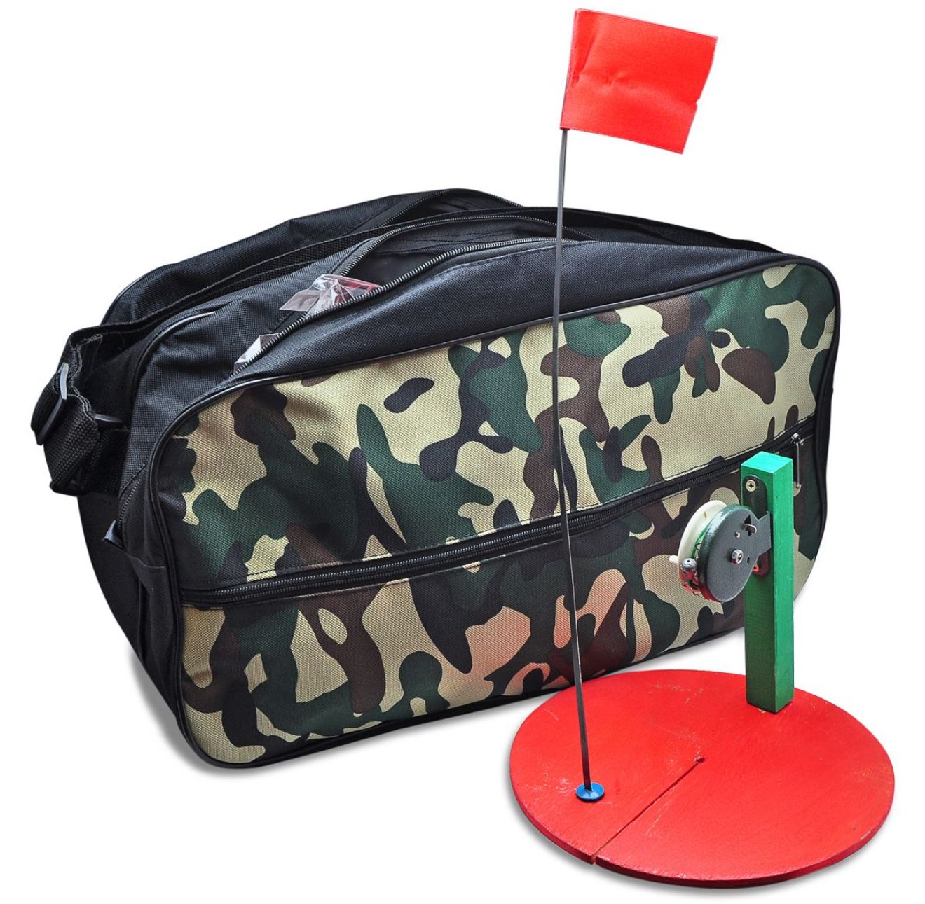 Эта снасть сконструирована таким образом, что при поклевке откидывается флажок-сигнализатор, который позволяет с дальнего расстояния увидеть, что рыба взяла живца. Комплектуется инерционной катушкой с тормозом, позволяющей производить все необходимые манипуляции со снастью. Оснащение жерлицы: леска, поводок с вертлюгом, скользящий груз "оливка" 8-10 гр, тройник №7.