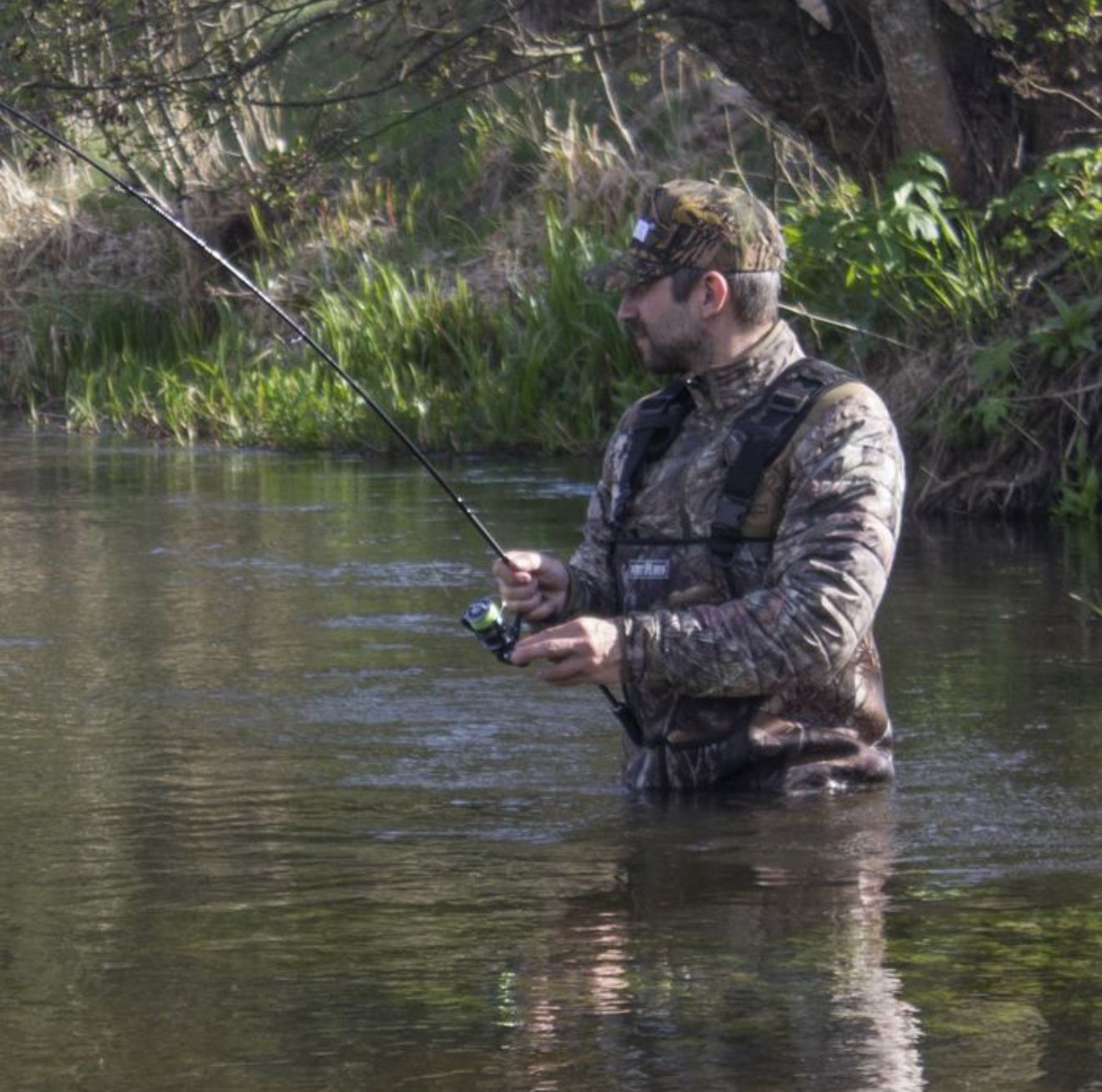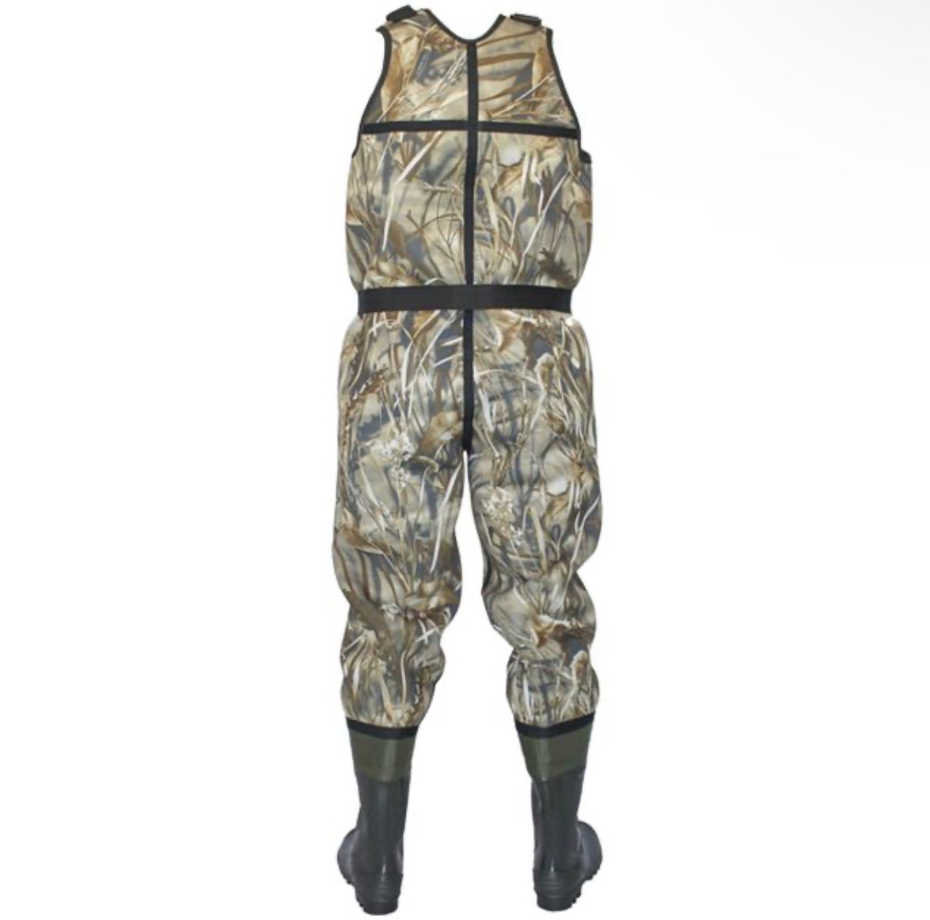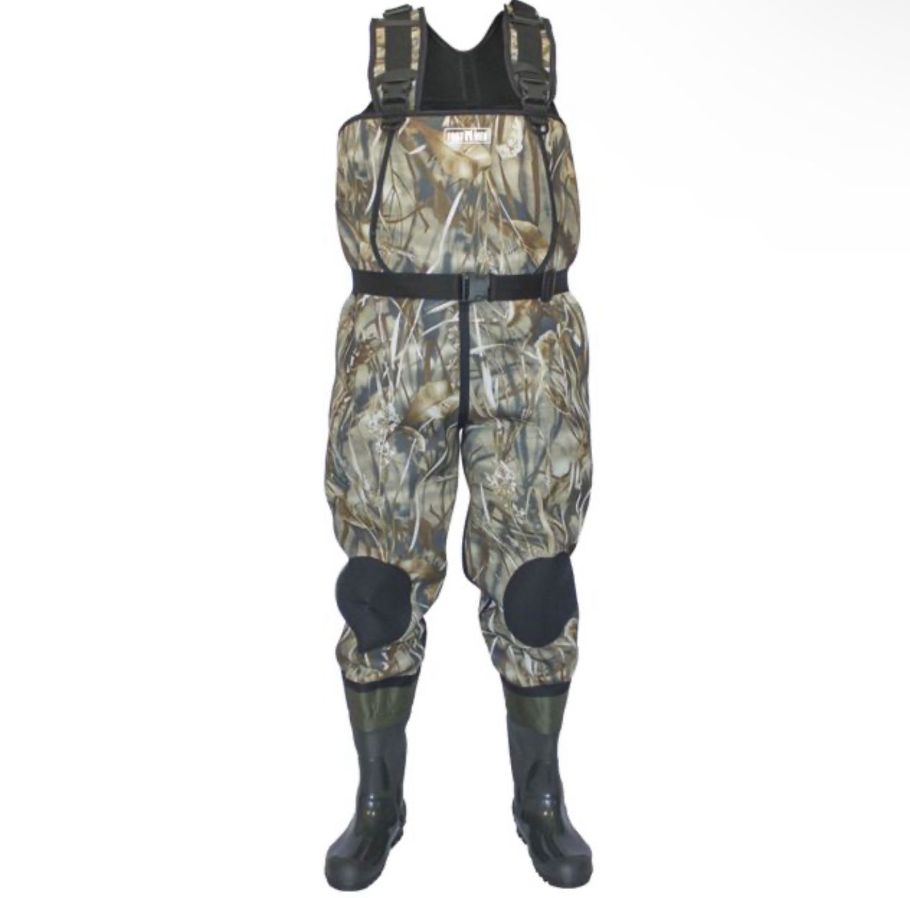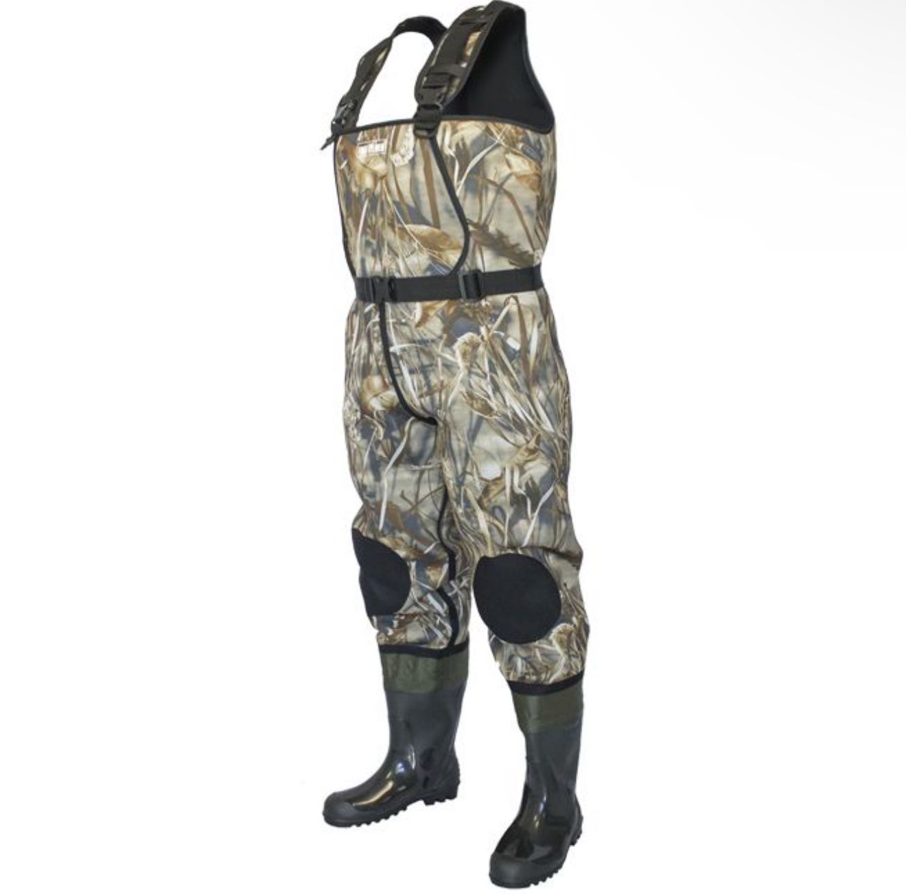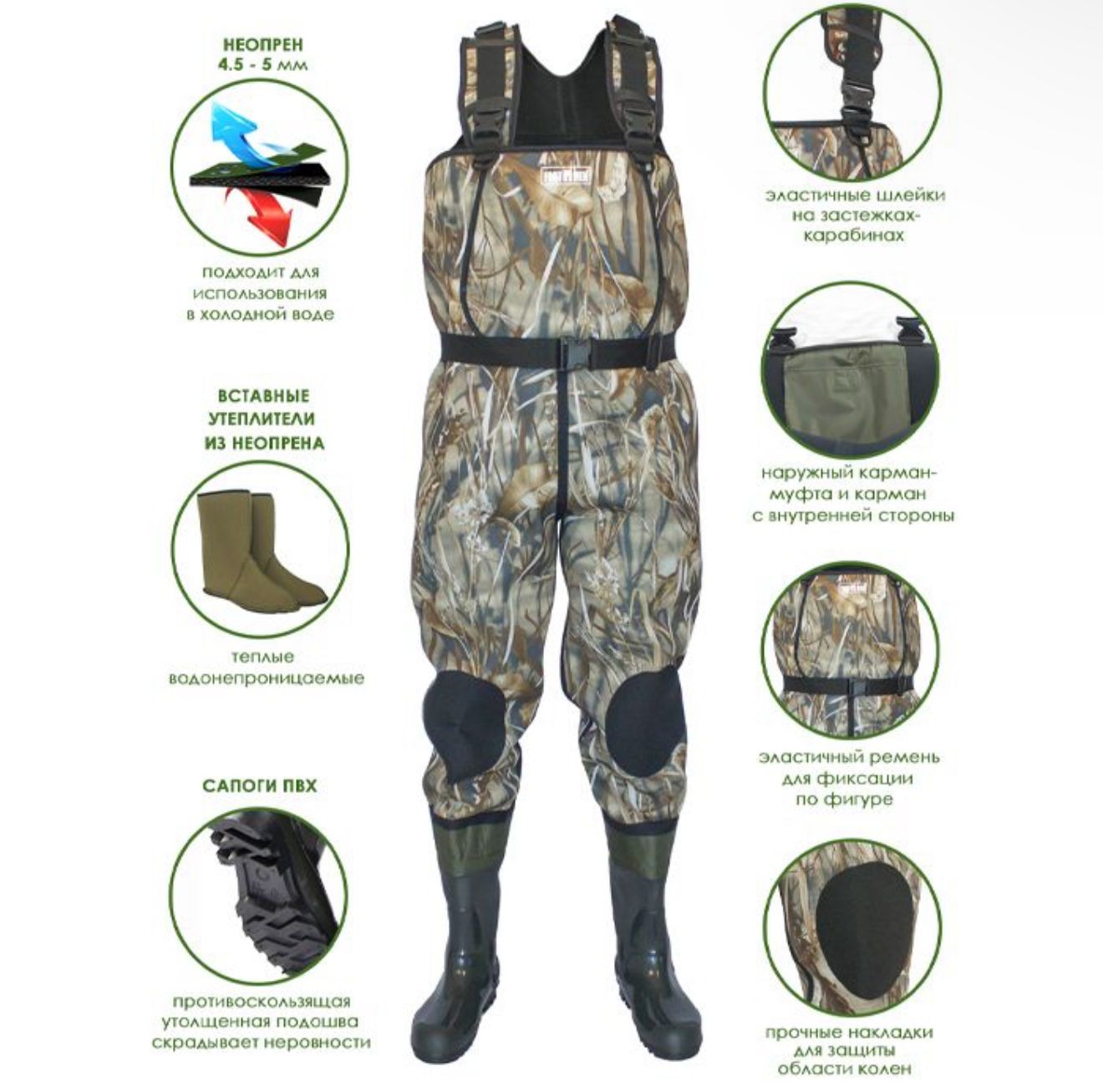 Напівкомбінезон виготовлений з неопрену камуфльованих кольорів - "дуб" або "очерет". Запатентовані забарвлення "TeclWood" чудово маскуються під строкатим тлом лісу або очерету.