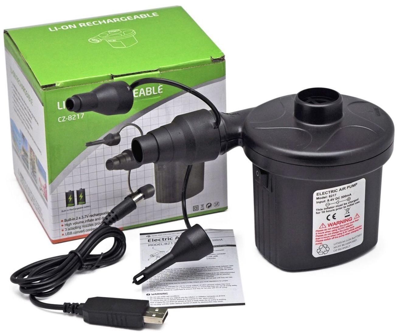 Портативний повітряний насос CZ-8217 з акумулятором 1500 мАг, який заряджається через USB.