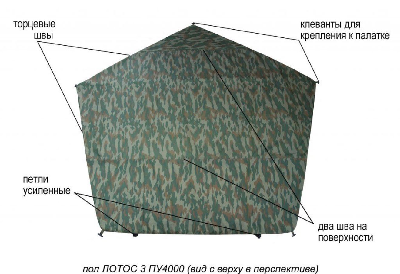 Утеплений пол ЛОТОС 3 ПУ4000 розроблений для палаток на стандартних каркасах «Лотос 3» і «Лотос 2». Пол має п’ятикутну форму та покриває всю поверхню дна палатки. Використаний утеплювач товщиною 10 мм із алюмінієвим покриттям.