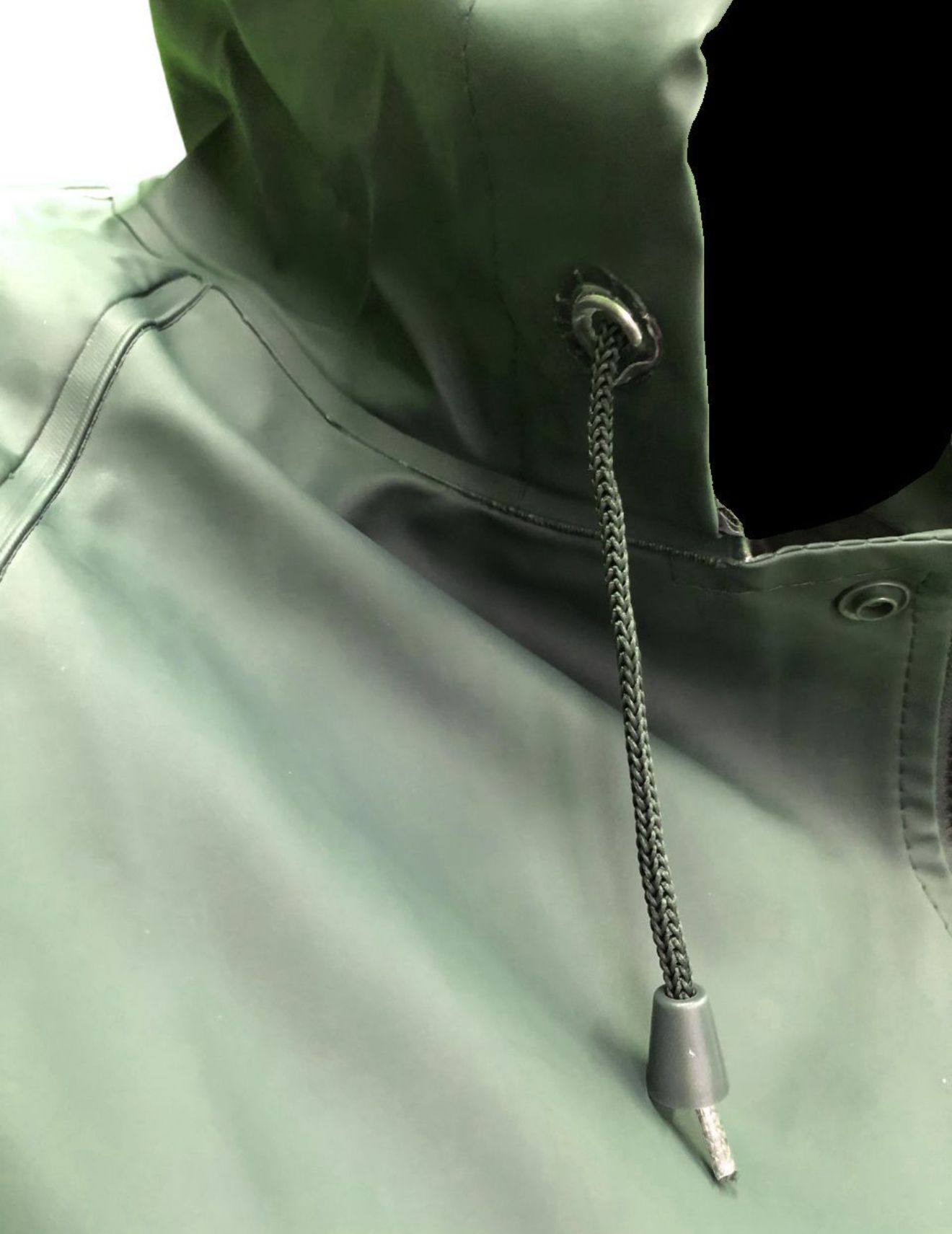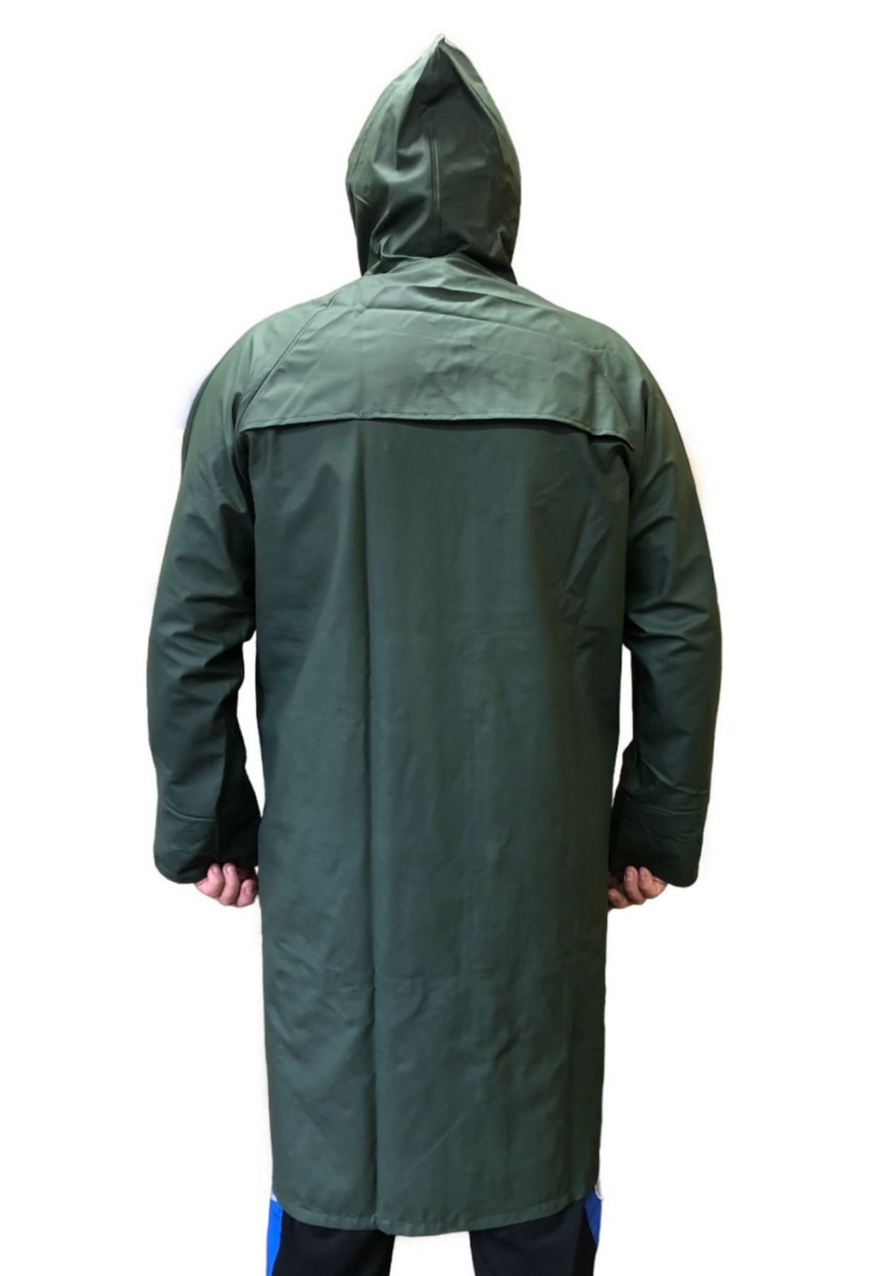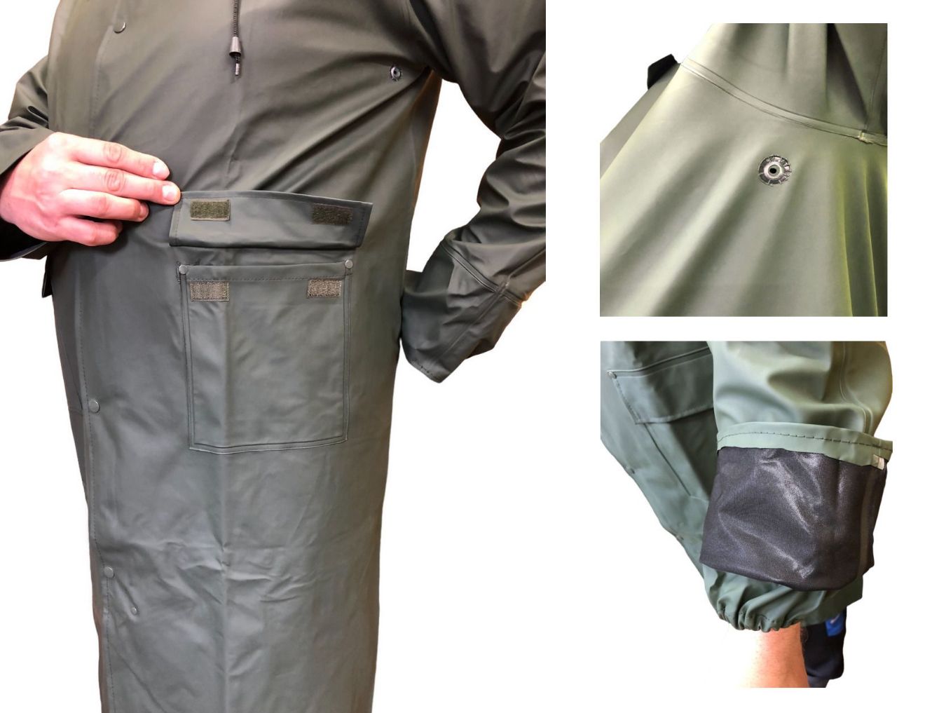Плащ-дощовик – невід'ємний атрибут осінньої риболовлі. Виготовлений із щільної тканини, що не пропускає воду, на поліестеровій основі з внутрішнім шаром з PVC. Шви надійні та гарантують максимальну водонепроникність. Плащ обладнаний капюшоном. Основна застібка додатково має спеціальні кнопки-застібки.