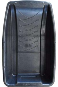 Санки виготовлені з морозостійкого пластику та мають форму, оптимізовану для руху по льоду та подолання засніжених ділянок. Форма днища забезпечує стабільний напрям руху та мінімальний опір, що значно полегшує пересування. Товщина стінок 3 мм надає необхідну жорсткість при транспортуванні риболовного спорядження, а завдяки властивостям матеріалу контактна поверхня саней майже не стирається. Для міцності та зручності пересування на дні санок сформовані полоззя.