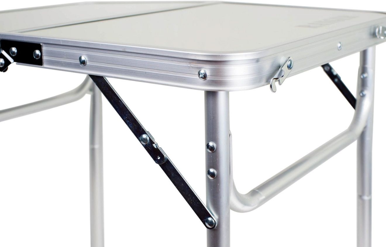 Лёгкий, удобный, устойчивый стол ещё и регулируется по высоте в двух положениях. Алюминиевый профиль увеличенной ширины — 50 мм. Столешница из ламинированного ДВП. Комплектуется чехлом.