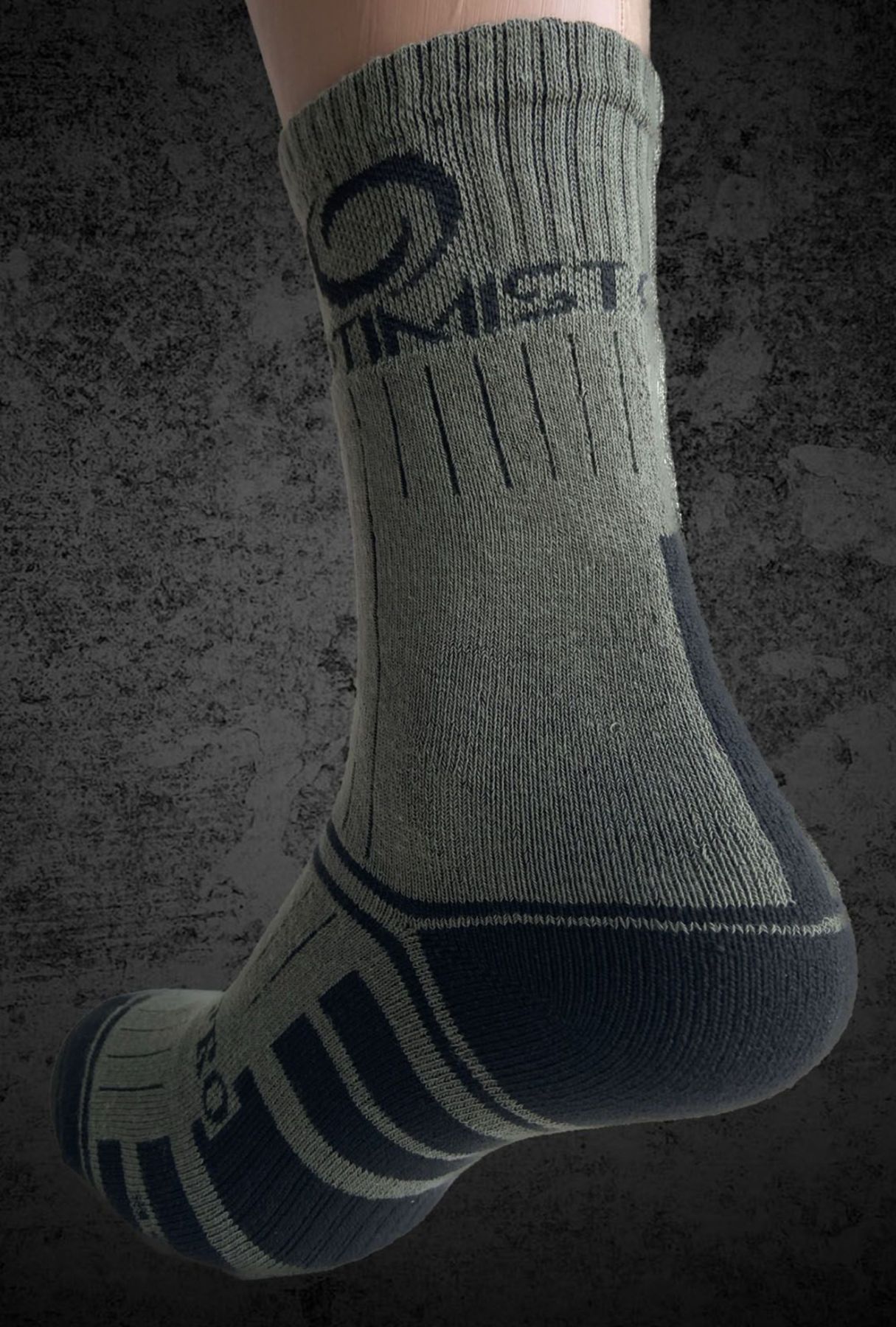 Термоноски Optimist "Барс" — високі трекінгові шкарпетки кольору хакі, створені для збереження тепла та комфорту під час активного використання в холодну пору року. Ідеально підходять для туризму, полювання, риболовлі, занять спортом або служби в польових умовах, де потрібне надійне тепло та зручність у важкому взутті.